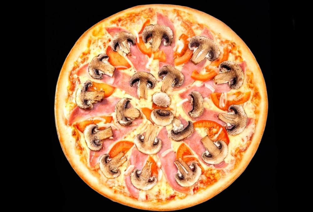 Ветчина, грибы, болгарский перец, помидоры, сыр моцарелла, соус красный/белый